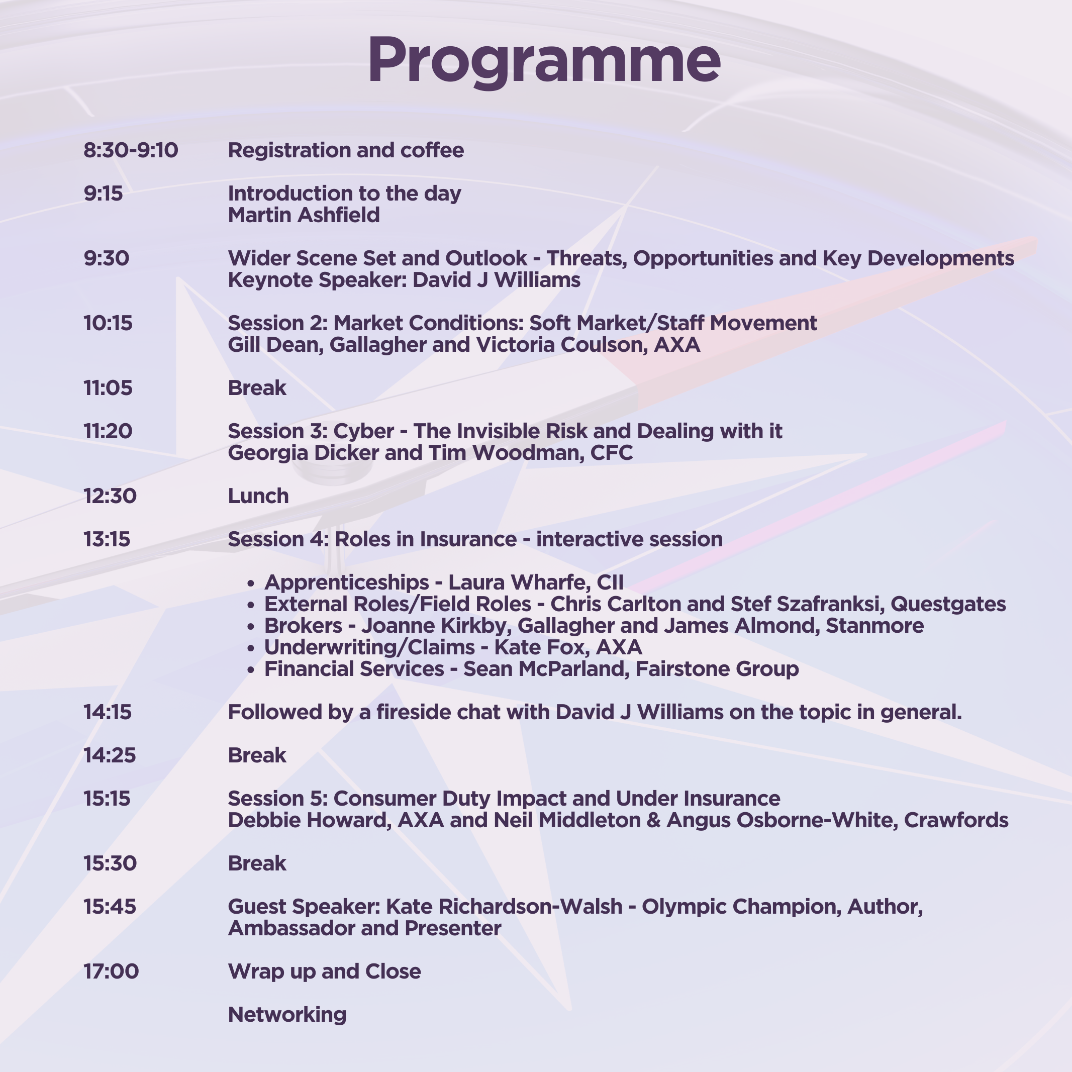 The theme for the day is "Navigating Change in Insurance" where we will explore market challenges and issues. We will be announcing speakers soon, but we are delighted to announce the programme for the day as follows: