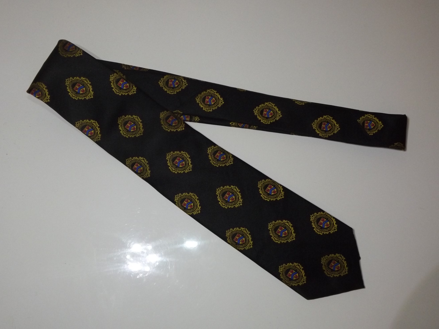 A black tie featuring the SII logo in gold, with red and blue detail. This is a beautiful woven silk blend tie.