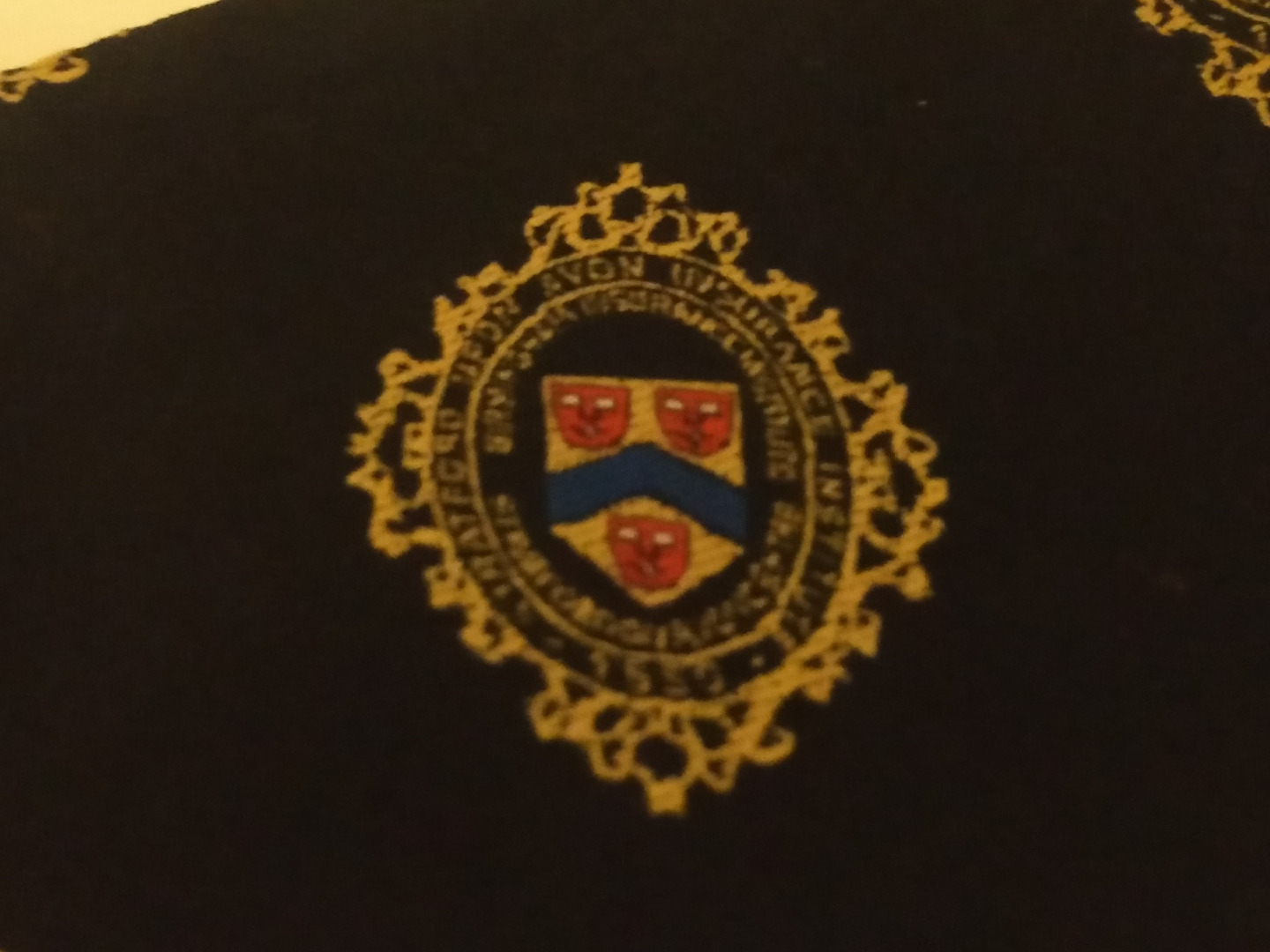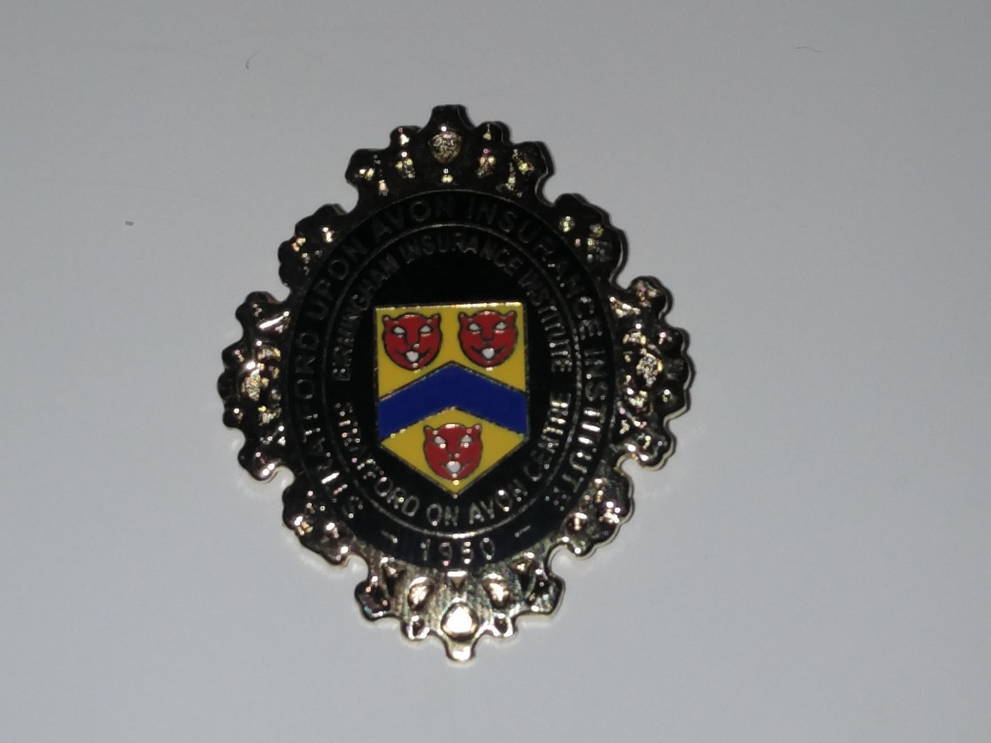 A beautiful enamel broach or pin featuring the SII logo. This is 3.5cm x 3cm in a gold colour backing featuring black enamel with gold lettering and the yellow blue and red detail of the Stratford Upon Avon crest.